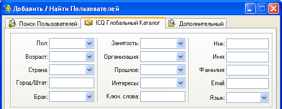 Для поиска доступны не только основные параметры - UIN, e-mail, имя, фамилия и ник, - но и всякие экзотические вроде ключевых слов или участия в чат-группах, а также всевозможные варианты личных данных, вписанных в информацию о пользователе: