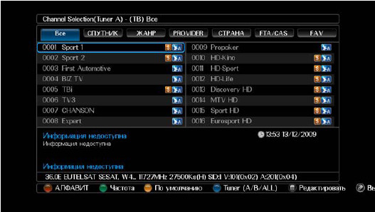 В списке сервисов дается следующая информация: номер и название сервиса, спутник, информация о канале, информация о транспондере.