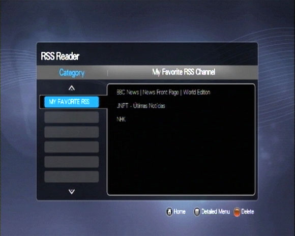 RSS - ридер RSS-потоков. На черта он нужен в медиаплеере, не вполне понятно, но тем не менее. Сервисы вроде Google Reader не поддерживает, нужно просто задавать адрес потока - будет показывать заголовки и развернутые аннотации и статьи.