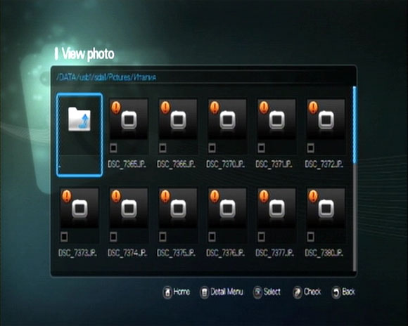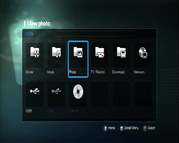 Фото и музыка - ну, тут дело понятное. Просмотр файлов в различных видах, проигрывание по отдельности или в режиме зацикливания-слайд-шоу. При поиске файлов доступны как базовые зарезервированные папки, так и сеть, USB-устройства.
