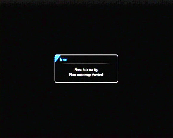Впрочем, при просмотре фото возник странный глюк. Когда я натравил плеер на папку с обычными цифровыми фото с шестимегапиксельного фотоаппарата, агрегат вдруг заявил, что изображения, дескать, слишком большие, для того чтобы он их показал. А они там всего-то по три мегабайта.