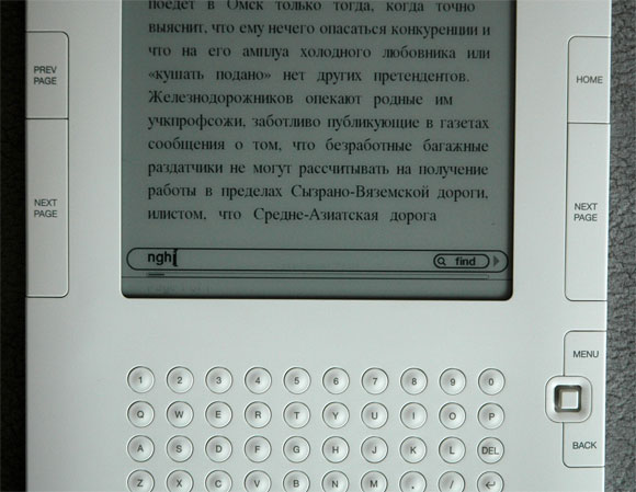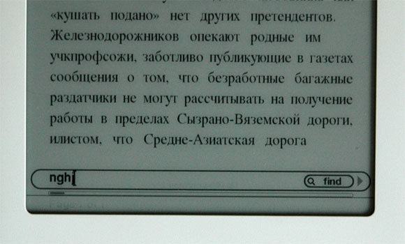 Благодаря наличию клавиатуры поиск в тексте делается легко и удобно. Впрочем, с поиском русского текста ничего не получится - и вряд ли получится в дальнейшем.