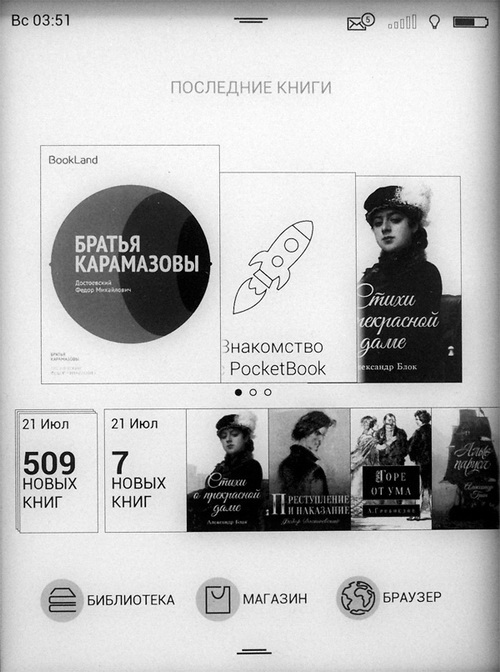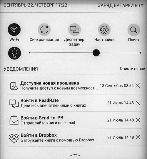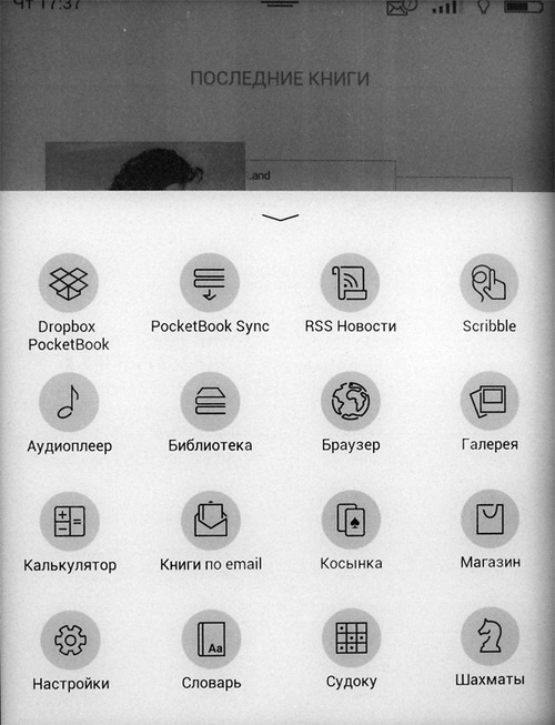 Приложения, появляющиеся по смахивающему жесту от низа экрана (шеврона) на главной странице. Различные сервисы, игры, приложения, настройки. Если для чтения вы пользуетесь различными ридерами и смартфонами, то лучше воспользоваться сервисами синхронизации контента: через Pocketbook Sync или Dropbox.