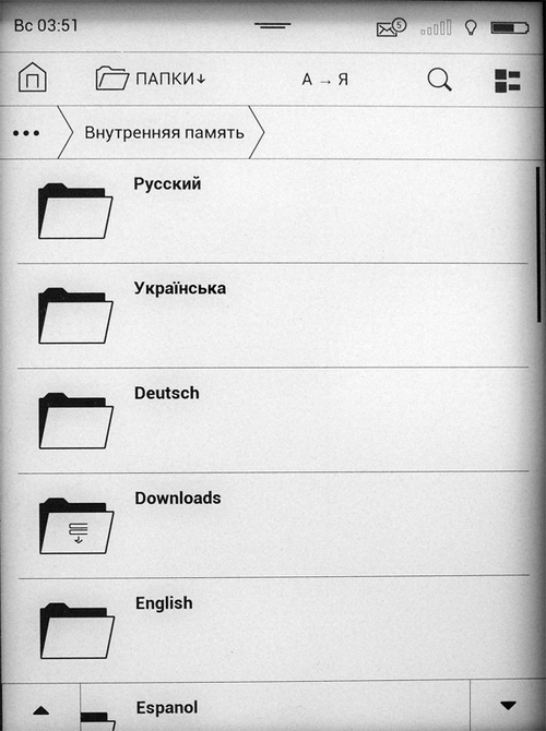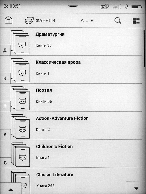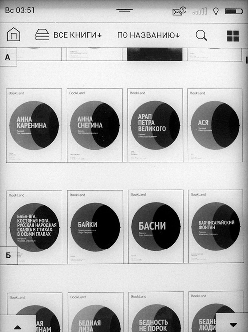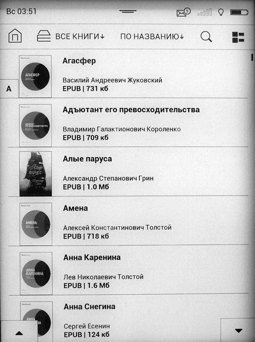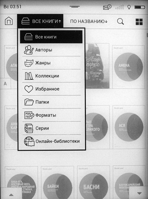Теперь переходим в раздел библиотеки: там показываются книги, которые хранятся в памяти устройства и на SD-карте. Вид представления книг, разумеется, можно менять.