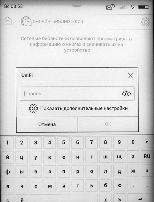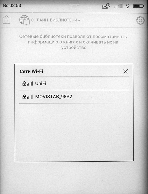 При попытке подключения к онлайн-библиотеке ридер предлагает подключиться к Wi-Fi.