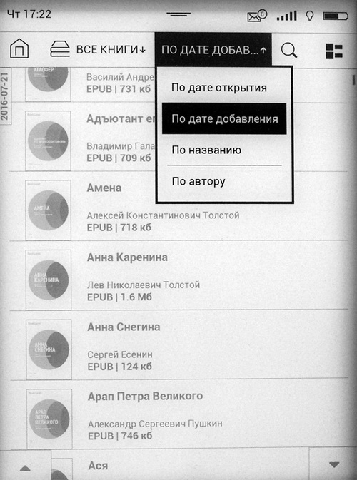 Возвращаемся в библиотеку. Виды сортировки: по дате открытия, дате добавления, по названию и по автору.