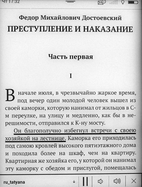 Режим аудиокниги. Выбранный голос (мужской, женский) вслух читает текст. Громкость регулируется. Понятно, что по качеству это сильно отличается от аудиокниги, начитанной профессиональным актером, но тем не менее я знаю, что многие этим сервисом пользуются в дороге для книг, которые не выпускали в аудиоварианте.