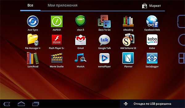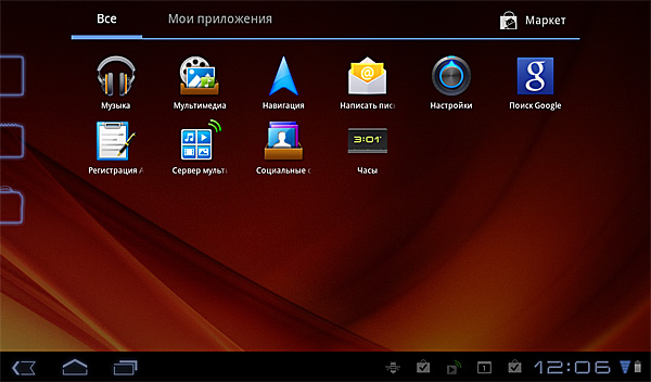 Тут сделано довольно своеобразно. В стандартном Android приложения располагаются в отдельных окнах, и эти окна пролистываются. В некоторых планшетах пиктограммы лежат в одном окне, которое пролистывается вниз. Здесь - в одном окне, которое пролистывается вбок. А если ткнуть пальцем в свободное место экрана - почему-то появляется стартовый десктоп. На черта так сделали - непонятно совершенно: раздражает и очень мешает. И логика не ночевала.