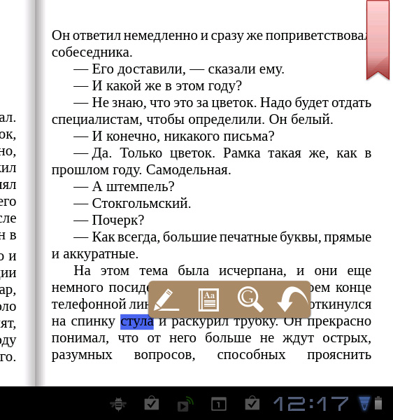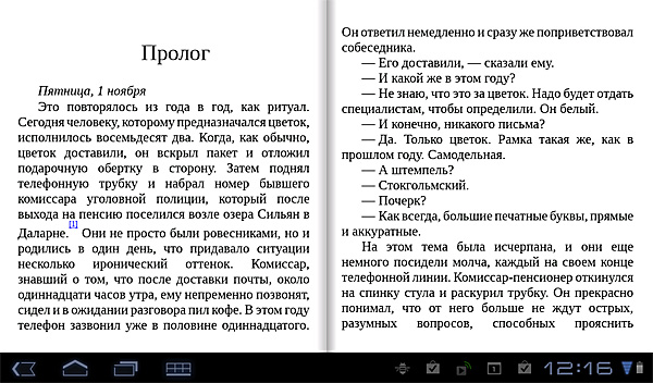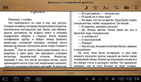 Посмотрел, как работает с EPUB, - очень даже прилично. Есть двухстраничный режим, пять размеров шрифтов, поиск, снимок экрана, закладки, пометки, комментарии, выделение текста (правда, выделение делается не особенно удобно, но работает), поиск выделенного фрагмента в Google.