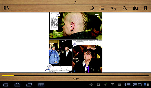 С PDF работает на порядок хуже: масштабировать умеет, но при этом входит в какой-то кривейший режим, при котором только что увеличенный и выведенный на центр экрана участок уползает куда-то в сторону, потому что вся страница после увеличения фрагмента немедленно центрируется. Идиотизм. Работа с документом при этом идет по следующей схеме: сдвинул - масштабировал - снова сдвинул. Чтобы перелистнуть страницу - из режима масштабирования надо принудительно выходить. Отстой, короче говоря.