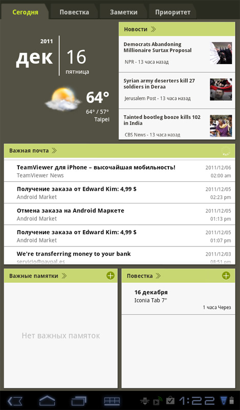 Любопытное приложение, которое интегрирует в себе почту, новости, заметки, погоду и календарь. Почта и календарь - внешние, настроенные в Android (в данном случае - аккаунт Google, но можно заводить любой другой).