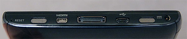Нижний торец - кнопка Reset, выход microHDMI, док-коннектор, microUSB, динамики, вход адаптера питания.