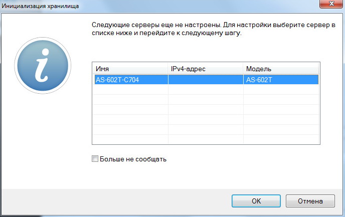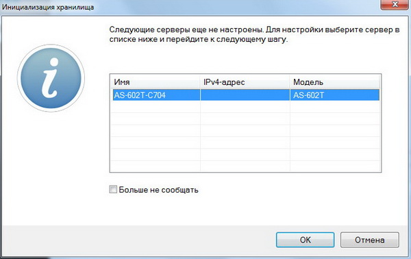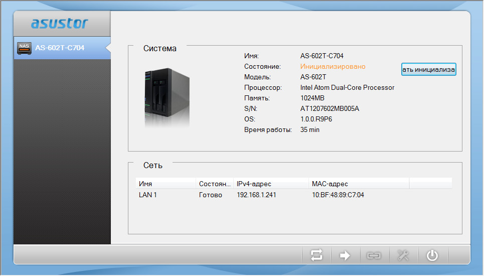 Для подготовки NAS нужно инсталлировать программное обеспечение с диска и запустить установленную программу. Если накопитель подключен к сети, программа его обнаружит и предложит инициализировать. (Далее все уменьшенные скриншоты - кликабельны.)