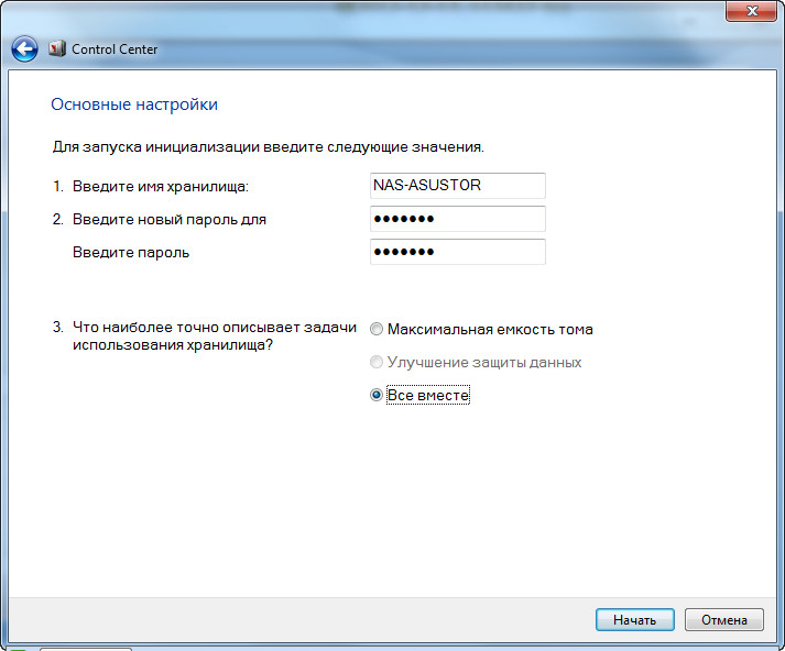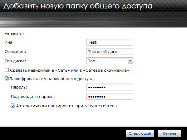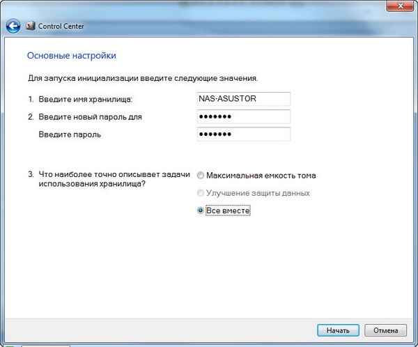 В момент настройки нужно ввести имя для хранилища, под которым оно будет фигурировать в вашей локальной сети, и задать пароль для администрирования (логин будет "admin", пароль - введенный вами).
