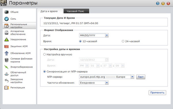 Региональные настройки. Дата и время могут синхронизироваться с NTP-сервером.