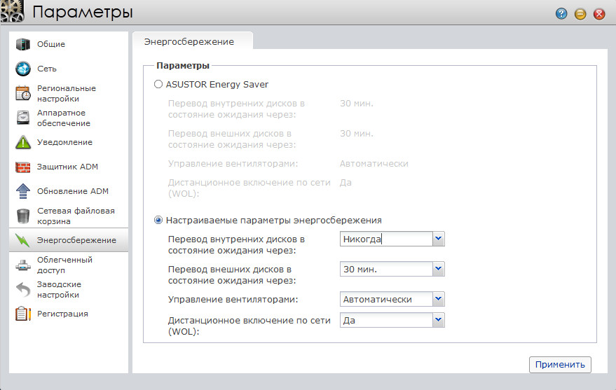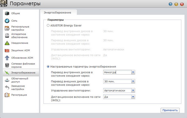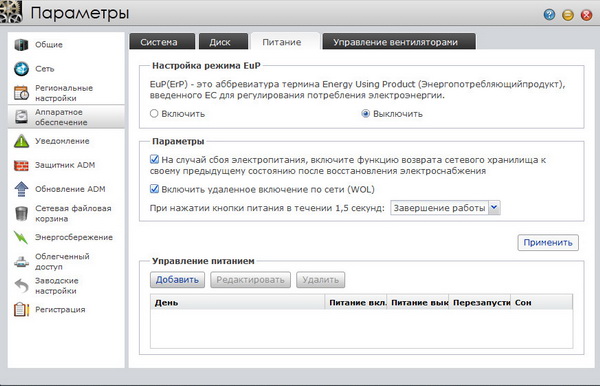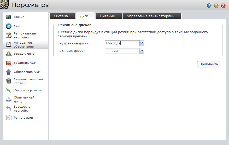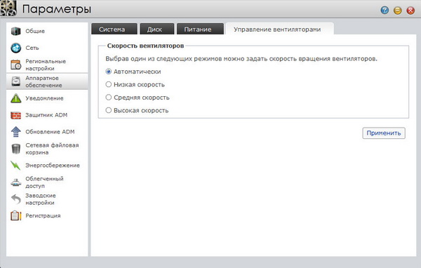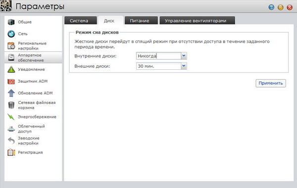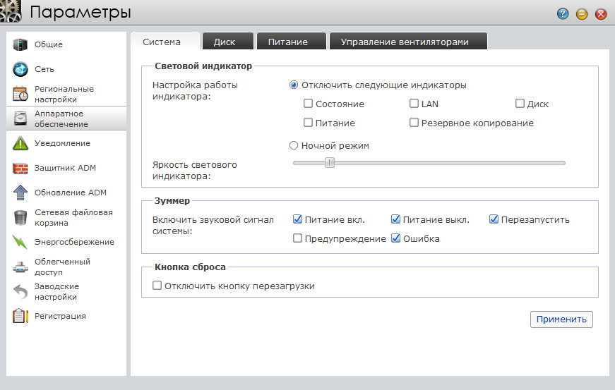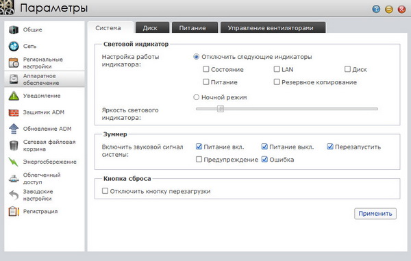 В настройках системы можно отключать индикаторы и звуковые сигналы - очень удобно для случаев, когда NAS стоит в комнате, в которой ночью спят. Если бы еще можно было задавать временные интервалы - было бы совсем здорово.