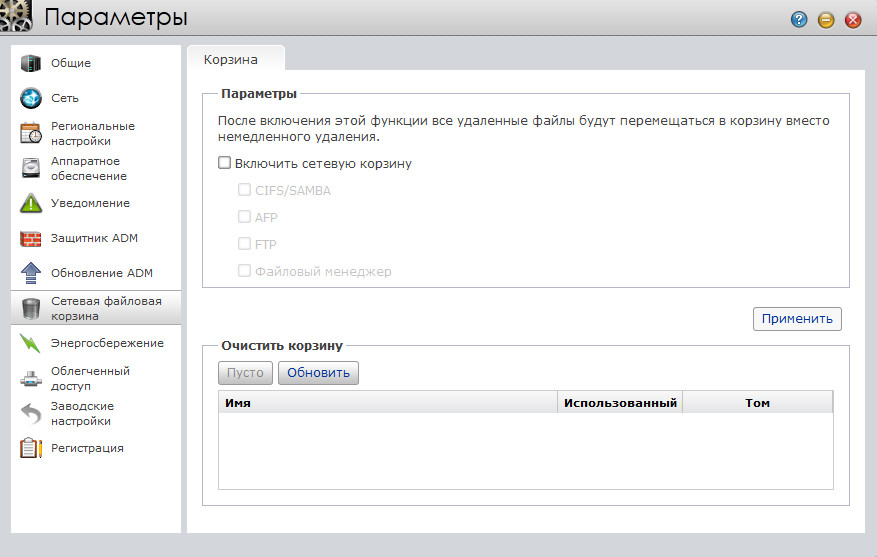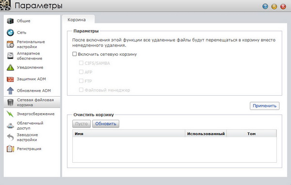 Параметры сетевой корзины: NAS можно настроить на удаление файлов в корзину.