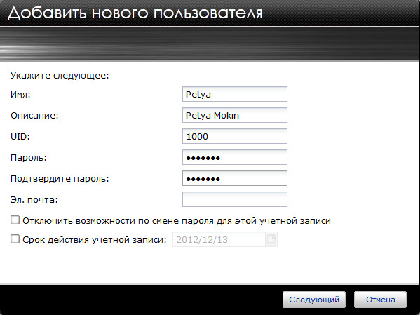 Добавляем нового пользователя. Это имя, описание и пароль. Пользователю можно разрешать менять свой пароль, а можно запрещать это делать.
