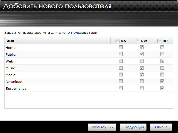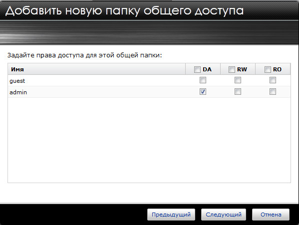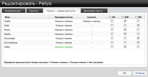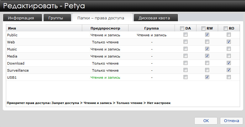 После этого можно отредактировать права пользователя по видам доступа к тем или иным стандартным папкам. DA - полный доступ, RW - чтение и запись, RO - только чтение.