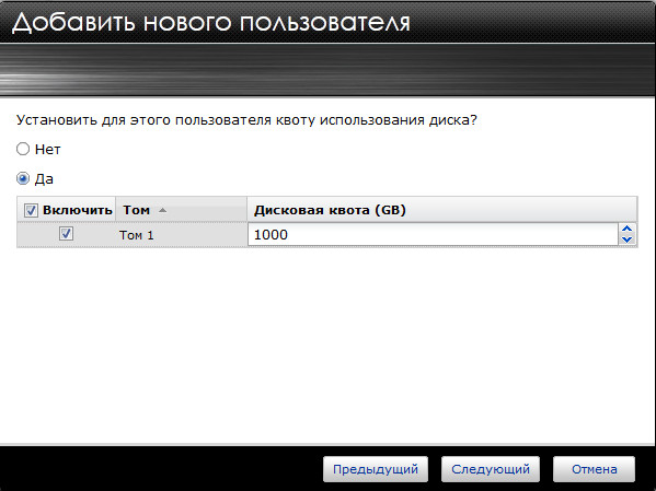 Для каждого конкретного участника можно устанавливать дисковую квоту, которая будет ему доступна для записи (если запись вообще открыта). Это очень удобно для случаев, когда вы хотите иметь возможность контролировать свободное пространство NAS: например, оно вам нужно для бекапов и вы не хотите, чтобы сынишка забил все свободное место музыкой и фильмами.