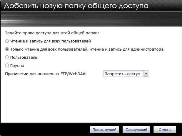 Далее задаются права доступа к этой папке - там есть несколько базовых вариантов.