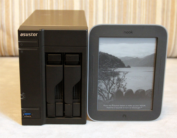 Передний торец по площади похож на шестидюймовый ридер - вот рядом с NAS ридер Nook Simple Touch Glow Light.