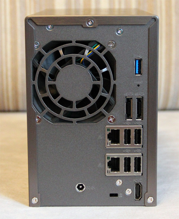 На задней панели размещены порты, количество которых, конечно, поражает: USB 3.0, 4 USB 2.0, 2 eSATA, 2 Gigabit Ethernet, HDMI. Ничего себе наборчик, да? Я такого больше нигде пока не видел. Плюс еще Reset, вход адаптера питания и кенсингтонский замок.