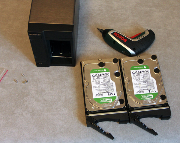 Вставляем туда два жестких диска по 1,5 Тб и прикручиваем их винтами.
