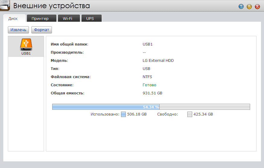 Он тут же появляется в системе. Обратите внимание, что по USB также можно подключать принтер (он станет сетевым), Wi-Fi-адаптер и источник бесперебойного питания.