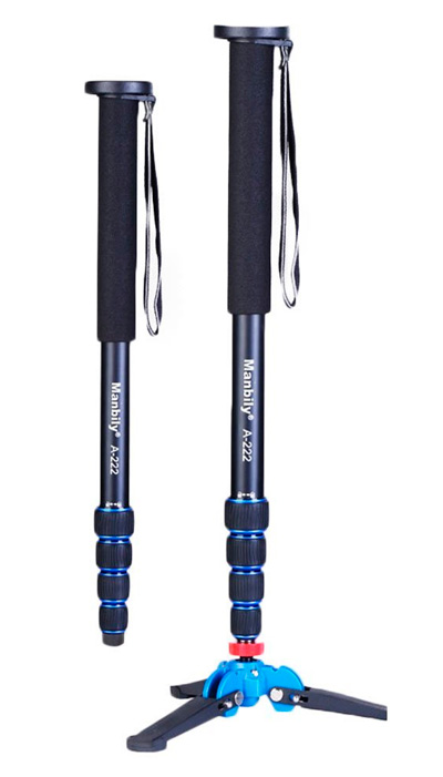 Я поизучал разные варианты и в конце концов остановился на модели Tarion A-222 (на Ali она называется Manbily a-222). Там можно взять монопод, монопод с трипод-подставкой (вот я такой вариант и взял), а также еще взять с дополнительной головкой с шарнирным креплением, но вот это мне не было нужно. Эта модель выдвигается до высоты в 165 см, на подставке стоит достаточно устойчиво, и ее также можно использовать для съемки на не слишком увесистую фотокамеру.