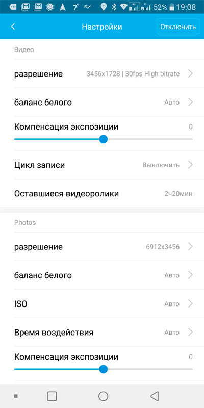 Предварительно через смартфон можно задать режим временной задержки для фото и режим съемки для видео - они запоминаются. Для фото, например, можно выставить временную задержку в столько-то там секунд, если камера используется с моноподом: нажал на кнопку, отошел, она сфотографировала.