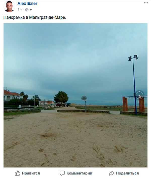 Теперь о том, как это использовать. Всякие социальные сети обычно умеют работать с панорамами - в них можно экспортировать снятые панорамы прямо с телефона. Качество там портится, но результат получается удовлетворительный. Вот, например, эта панорамка, опубликованная в Facebook.