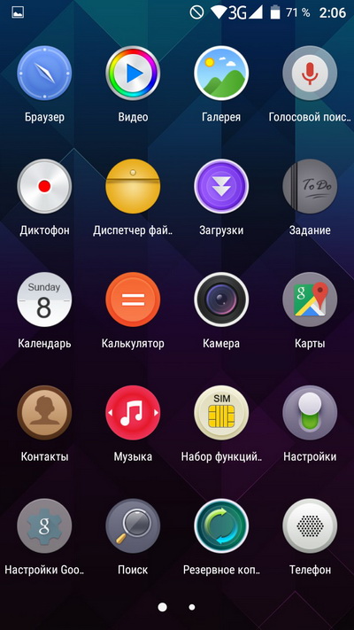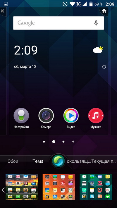 При нажатии кнопки меню на десктопе кроме всяких обычных настроек можно также выбрать одну из нескольких предустановленных тем: там поменяются и цветовое оформление, и иконки приложений.