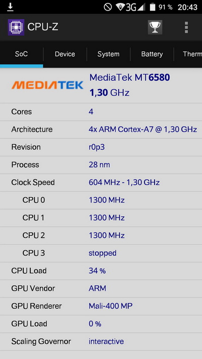 Процессор: MTK6580, 4-ядерный, 1,3 ГГц