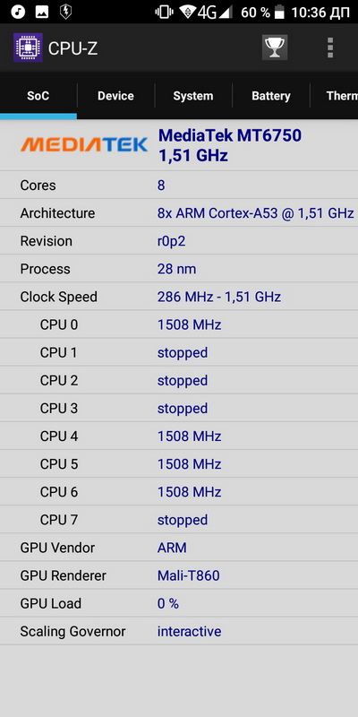 Данные кишочков смартфона по CPU-Z. Кстати, CPU-Z показывает, что здесь установлен чип MT6750, а на самом деле здесь MT650T - эта версия несколько быстрее за счет прироста частот.