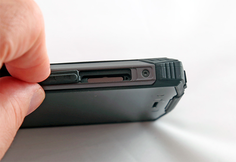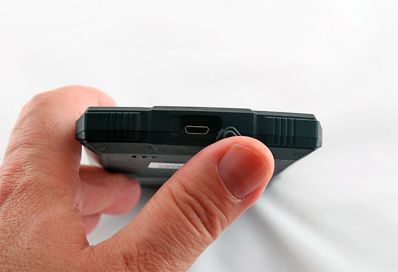 Внизу под пластиковой заглушкой - порт microUSB. Заглушка открывается без риска сломать себе ноготь, даже если вы не гламурный лесоруб, который ногтем перерезает шею оленю, а хилый блогер с маникюром. Отмечу также, что порт хотя и сидит глубоко, но для него не требуется специального кабеля с удлинненной головкой: у меня туда нормально подключался самый обычный кабель.