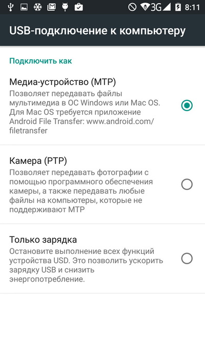 При подключении к компьютеру появляется вот такое меню, в котором запоминается выбранное значение. (В стандартном Android не запоминается, всегда включается режим "Только зарядка".)