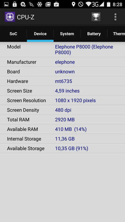 Сравниваем, конечно, с моделью Elephone P7000. Менее мощный SoC - MTK6753 против MTK6752, графический ускоритель тоже менее мощный (Mali-T720 против MALI-T760), карты памяти поддерживаются до 128 Гб, увеличился аккумулятор - 4165 мА·ч против 3450 мА·ч, но и из-за этого смартфон потяжелел - 209 граммов против 189 граммов. Цена стала ниже - 170€ против 200€ у P7000.