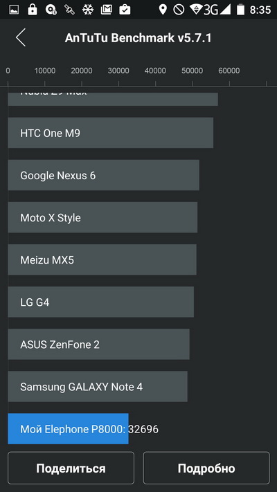 AnTuTu выдал что-то около 45300 (64 битная версия). Всего чуть-чуть отстает от Galaxy Note 4, который сторит под 500€.