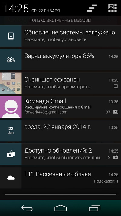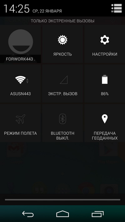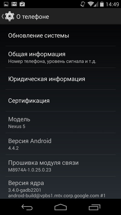 Первоначально здесь была установлена система Android 4.4, однако совсем недавно она обновилась на Android 4.4.2: насколько я понимаю, на данный момент это единственный телефон с данной версией. (Ну и некоторые предыдущие Nexus.) Не то чтобы это что-то сильно меняло, но тем не менее.