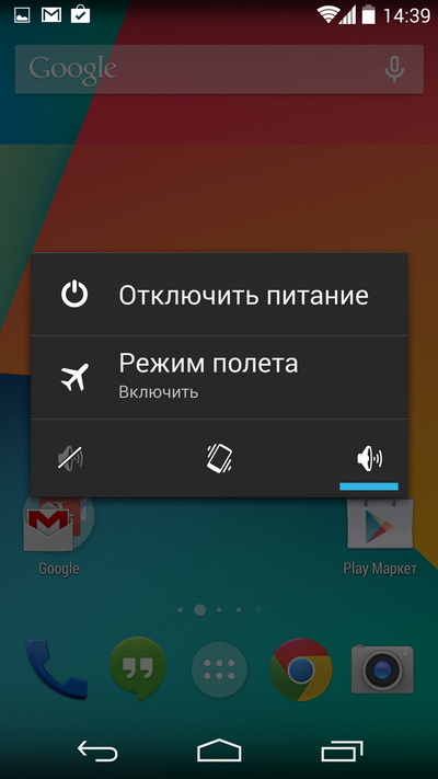 Меню по длинному нажатию кнопки питания.