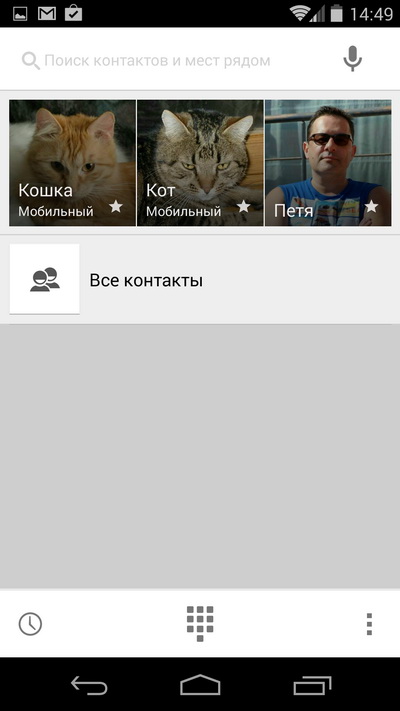 С телефоном и контактами мало что изменилось: это два разных приложения, хотя непонятно, что их мешает объединить. В телефонном приложении сверху выводятся последние звонки, ниже избранные контакты и есть ссылка на все контакты.