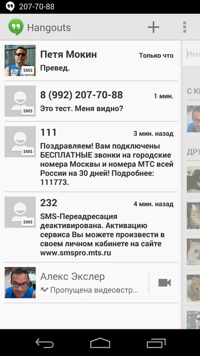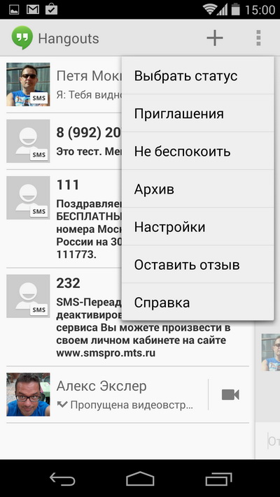 С SMS тут стало все совсем своеобразно. Вместо отдельного приложения все общение, включая SMS/MMS, повешено на Hangouts. Работает, правда, вроде нормально, обычный пользователь вряд ли заметит разницу. Но с сервисами тут бедновато. Впрочем, это Android, никто не мешает поставить другое приложение.