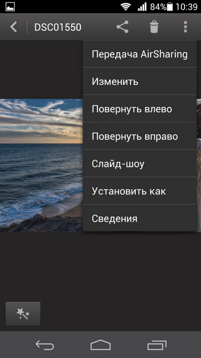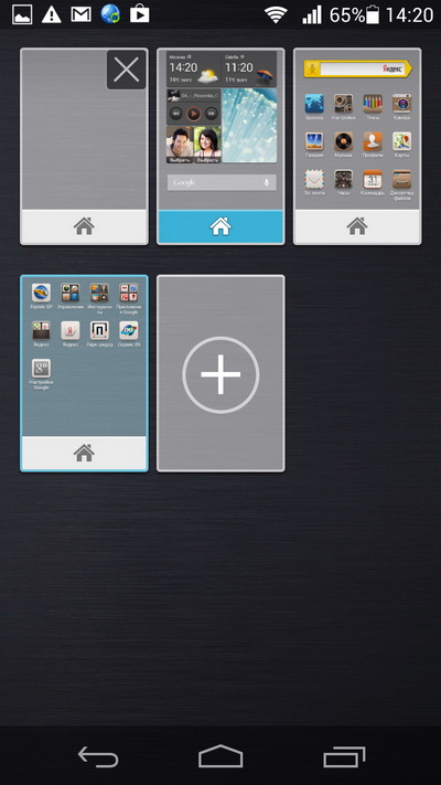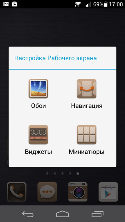 При длинном нажатии пальца на свободном месте экрана появляется меню настроек: обои, навигация (эффекты смены дисплея), добавление виджетов и миниатюры десктопов с их настройкой (изменение порядка, добавление и удаление).