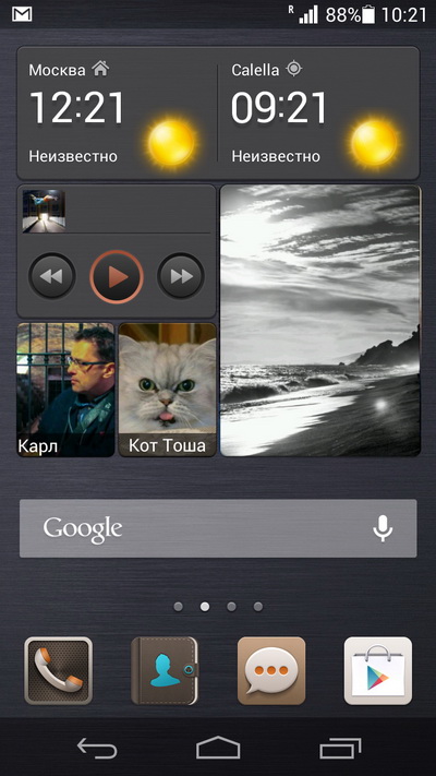 На главном десктопе как раз и установлено несколько виджетов: погодный, плеер, просмотр изображений, контакты и поиск Google.