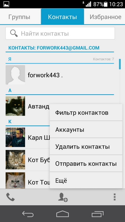 Контакты можно фильтровать, выбирать аккаунты для показа (например, только учетка Google или только сим-карта), редактировать и экспортировать.
