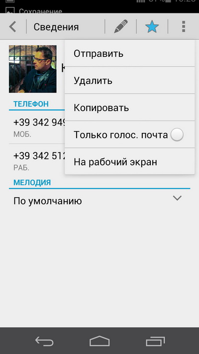 Меню контакта. Кстати, обратите внимание на опцию "Только голосовая почта" - это очень удобно: если ее включить, данный контакт будет сразу перенаправляться на голосовую почту.