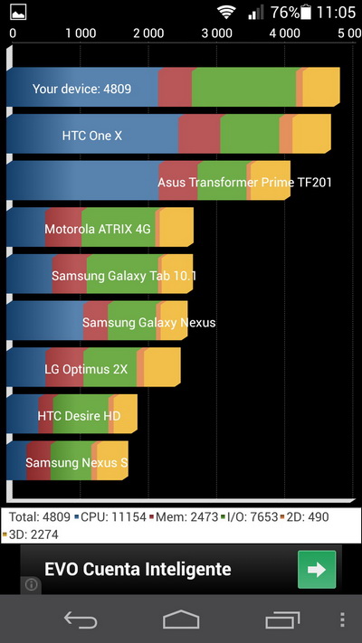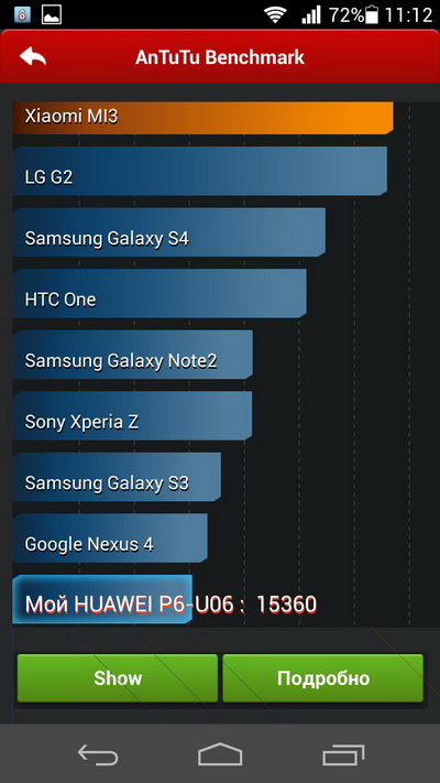 Antutu Benchmark - 15 380. И на гистограмме видно, что это означает. По скорости как Samsung Galaxy S III или Sony Xperia Z. А эти ребята - очень шустрые, хотя их уже заменили новыми моделями.