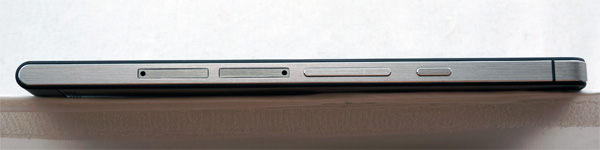 На правой боковой грани - два слота под сим-карту и microSD, которые выдвигаются с помощью прилагаемой скрепки, качелька регулировки громкости и кнопка питания.