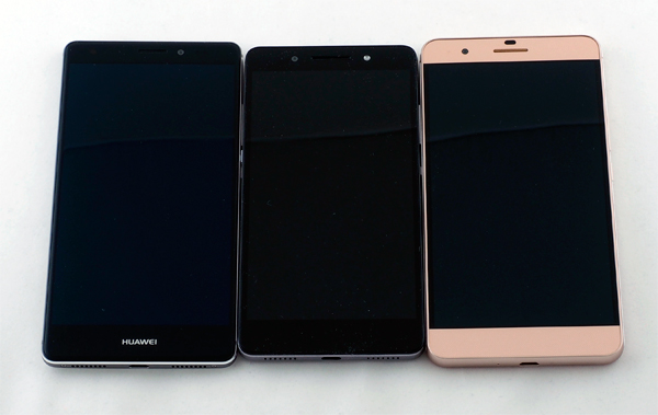 Ну и вот наш герой в компании друзей: слева - красавец Huawei Mate S, справа - Honor 6 Plus.